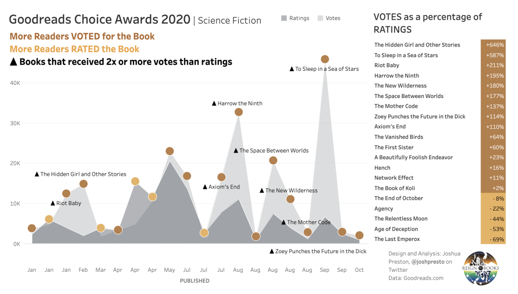 Fans of books published in the first quarter remembered their love and came back to vote for Q1 books (Riot Baby and The Hidden Girl and Other Stories). Midyear books (April-July) were strongest for both lifetime ratings and award votes. But the books that faired the best for voting season came out in August and September. Three of the four books with the most votes had at least twice the number of votes as lifetime ratings and were published in August or after. These include Harrow the Ninth, The Space Between Worlds, and the genre’s award winner To Sleep in a Sea of Stars. To see book details, explore the interactive data graphic. – Josh